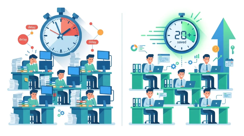 สมมติว่าพนักงาน 5 คนในองค์กรเสียเวลากับการกรอกข้อมูลซ้ำและงาน Manual วันละ 2 ชั่วโมง หลังใช้ SAP B1 เวลานี้ลดลงเหลือ 30 นาที ประหยัดได้ 1.5 ชั่วโมงต่อคนต่อวัน